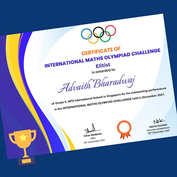 Congratulations to Advaith Bharadwaj for winning the Outstanding Performance Award at the International Maths Olympiad Challenge! He has competed with 2.5 million students between Grades 1 to 10, 3,638 schools across 34 countries!